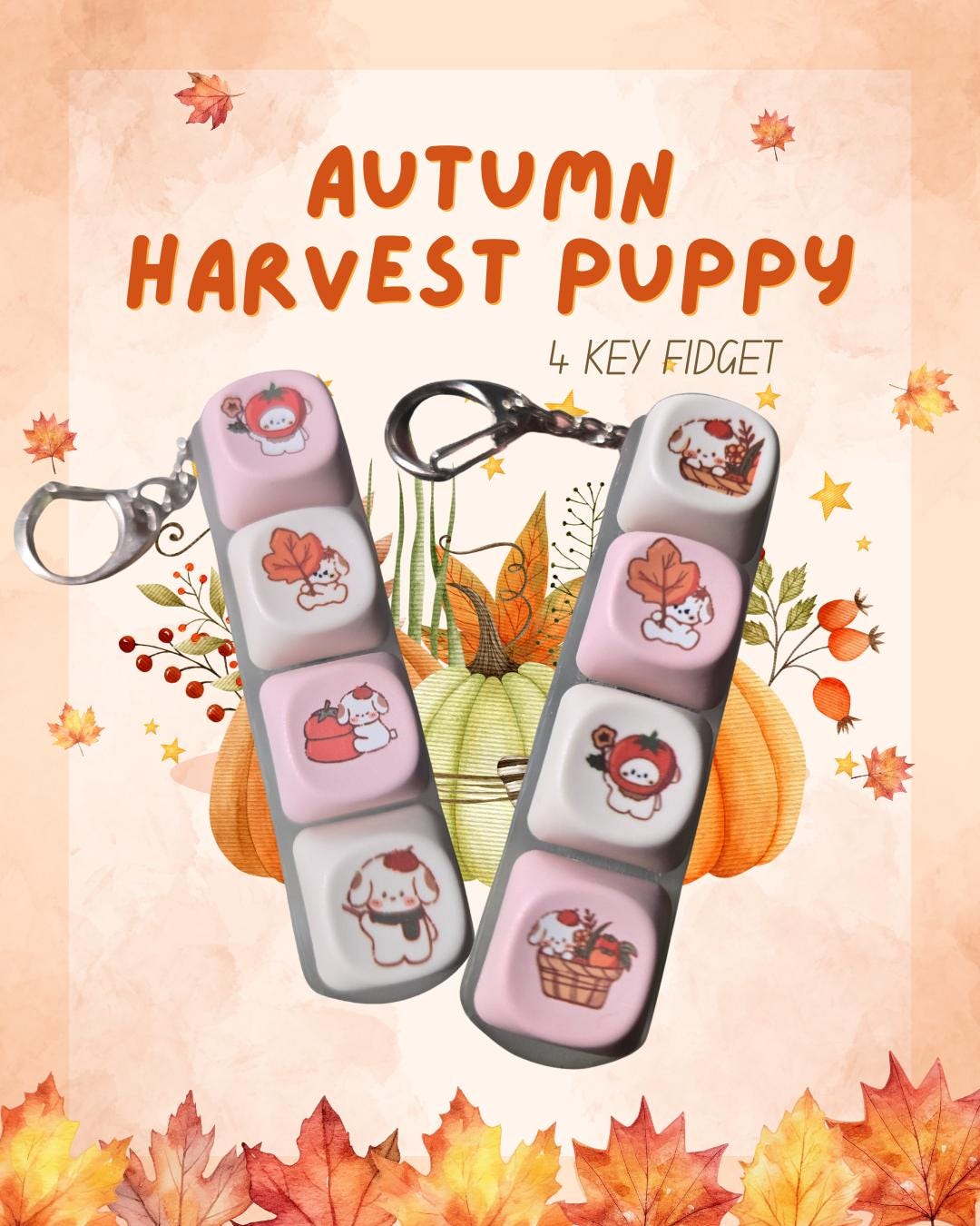 Build a fun Autumn Harvest Puppy themed 4 key fidget and unleash your inner fidgeter , satisfyingly clicky 4 key fidget. Featuring standard clicky, silent, or creamy switches, whichever you select! Enjoy satisfying feedback with each press! This is the ultimate stress-reliever for quirky individuals.